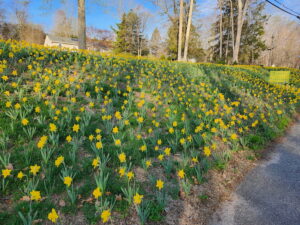 Bushy ‘Daffo-Hill”: The first bloom of 5,000 daffodils shine bright on the embankment at the intersection of Bushy Hill Road and Old Bushy Hill Road in Ivoryton thanks to community donations and the bequest from the late Elizabeth “Diz” Callender.